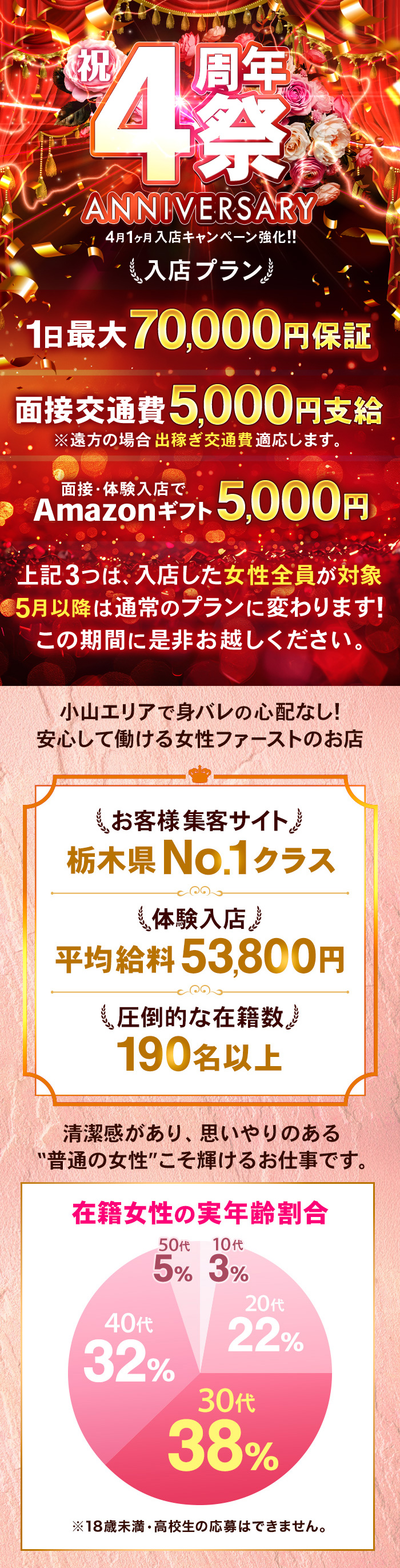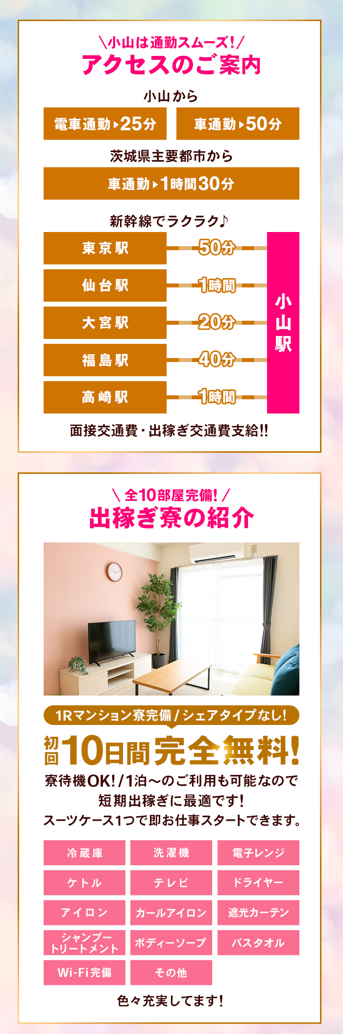 - JR小山駅東口から徒歩10分 電車でお越しの場合は小山駅までお迎えに上がります♪ お車での通勤も大歓迎です☆ 無料駐車場を多数ご用意しております!