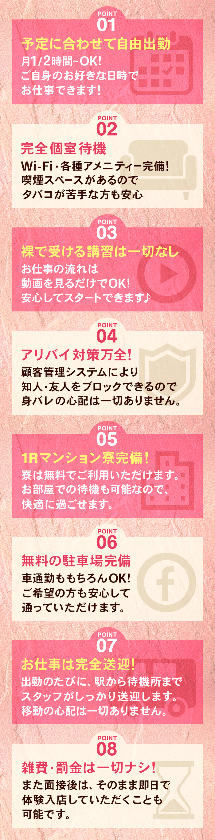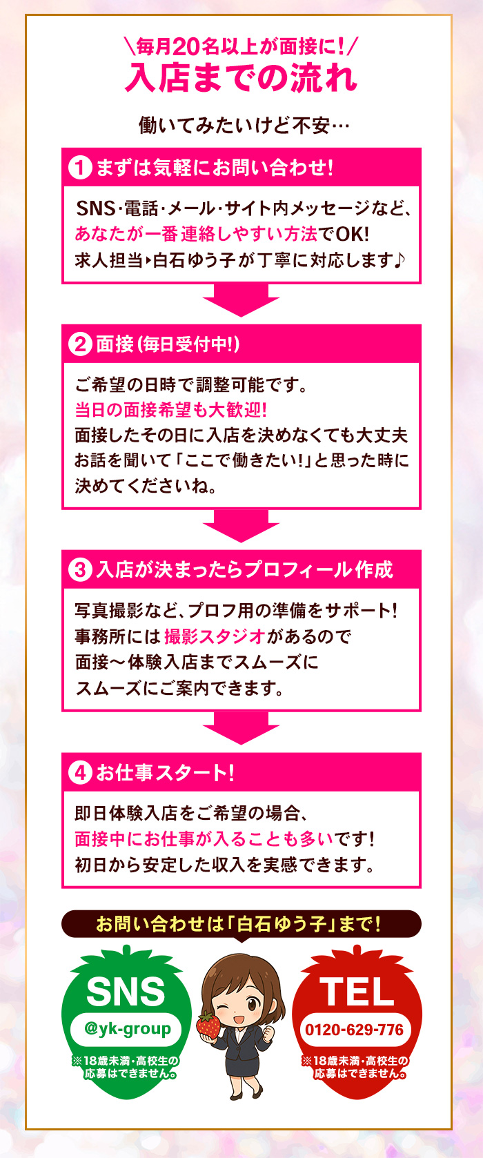 - 10:00~21:00 事前にご連絡頂ければ、21時以降でも待ちしております☆ 飛び込み面接大歓迎!
